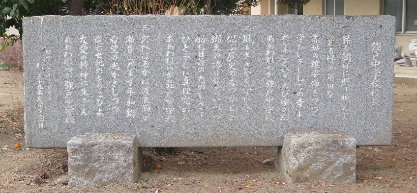 二 風もささやく 学び舎に 偲ぶ歴史の なつかしさ 郷土のほこり 背負いつつ 励む日毎の たのしさよ ひとすじに 真理究めん ああわれらが 強戸中学校 |