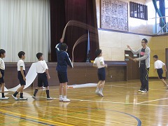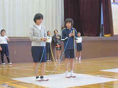 | 2人で1本の縄を跳んだり、ダブルダッチを音楽にのって跳んでいました。 | ||