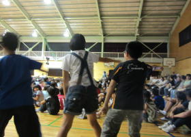 体育館で行われた演劇教室は、『劇団えるむ』のみなさんと韮川西小の児童が協力して