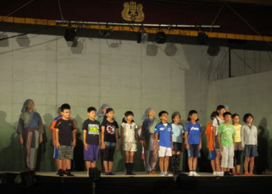 舞台の上に集まった児童が、劇団のみなさんと歌っています。
