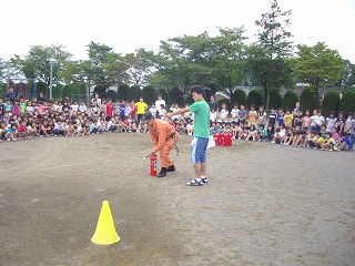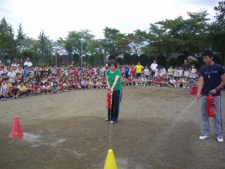 4日(金)に避難訓練を行いました。地震が発生し、その後火災が発生したという想定のもとに実施しました。東部消防署より4名の署員の方が来校し、避難の様子を見て、指導してくれました。さらに署員さんの指導により水消火器による消火訓練も行いました。