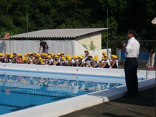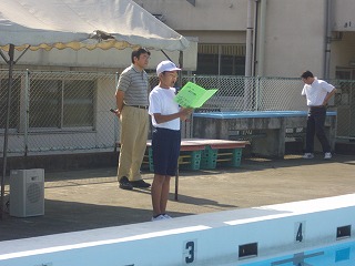 | この三ヶ月間、流れるプールや波のプール、着衣泳など、 今年の思い出の詰まったプールの時間となったことでしょう。 みなさんは、自分の立てた目標を達成できましたか。 ぼくの今年の目標は、平泳ぎで50メートル泳ぐことでした。 一生懸命に平泳ぎを練習したので、プール検定の日は、 平泳ぎで100メートルを泳ぎきることが出来ました。 今年のプールは、天気があまり良くなかった時や 寒いときもありましたが、みんなが決まりを守って、安全に楽しく、 泳ぐことが出来ましたね。 来年も、一人一人が目標を立てて、その目標が達成できるように、 努力していきましょう。そして、安全に気を付けて 楽しいプールの時間にしていきましょう。 児童代表 |